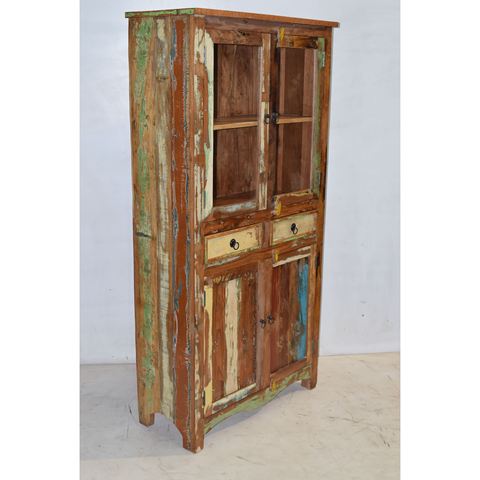 Reclaimed Boat Wood Glass Display Cabinet Vintage Look Functional Storage for Living Room or Kitchen